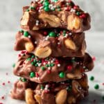 A close-up image shows a stack of five thick, uneven chocolate clusters, each studded with large peanut pieces inside and out. The clusters have a smooth, creamy milk chocolate texture with swirls and lumps where the peanuts are embedded. The top cluster has a bite taken out, revealing the golden peanut pieces inside the soft chocolate. Small round sprinkles in red, green, and white are scattered across the top cluster, adding bright spots of color against the rich chocolate. The background has a soft, white marbled texture. photo taken with an iphone --ar 4:5 --v 7