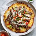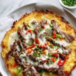 - Add steak and veggies: Distribute the cooked steak strips and sautéed onions and peppers evenly on top of the cheese layer.